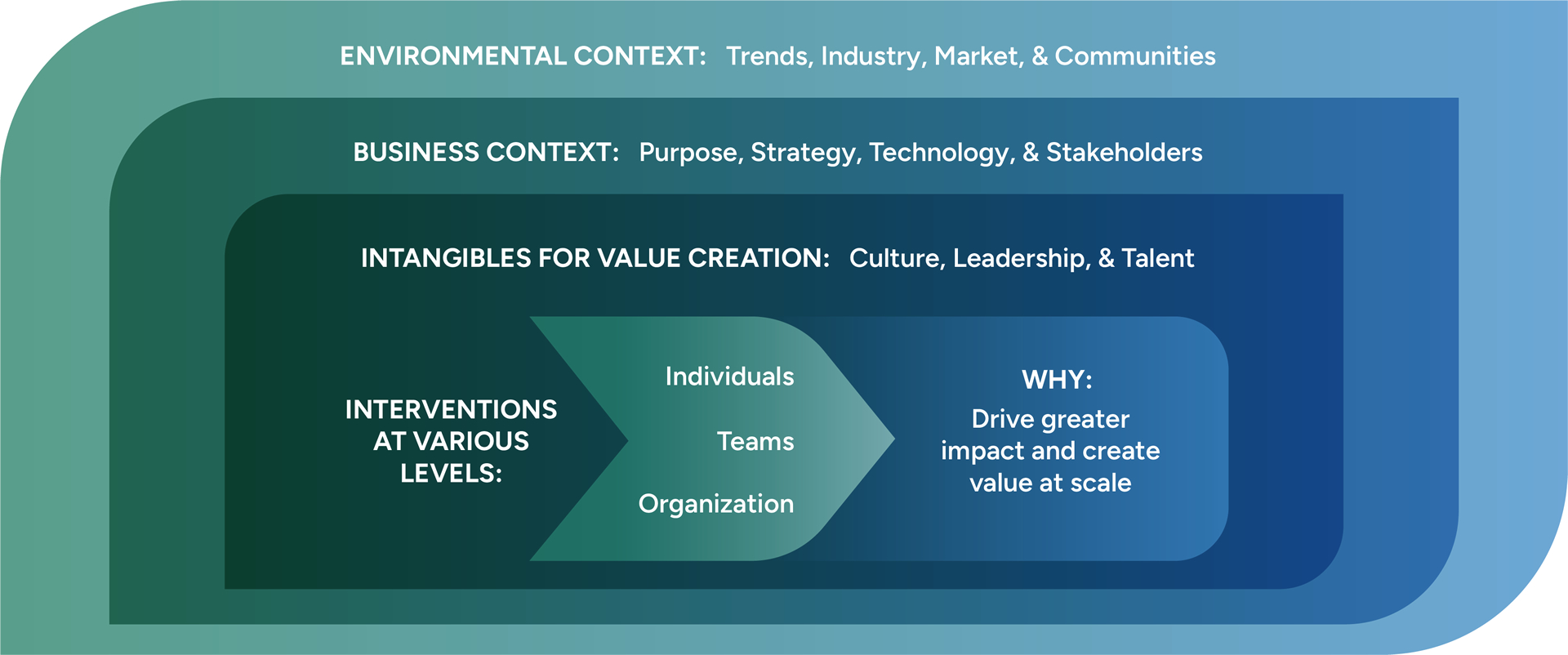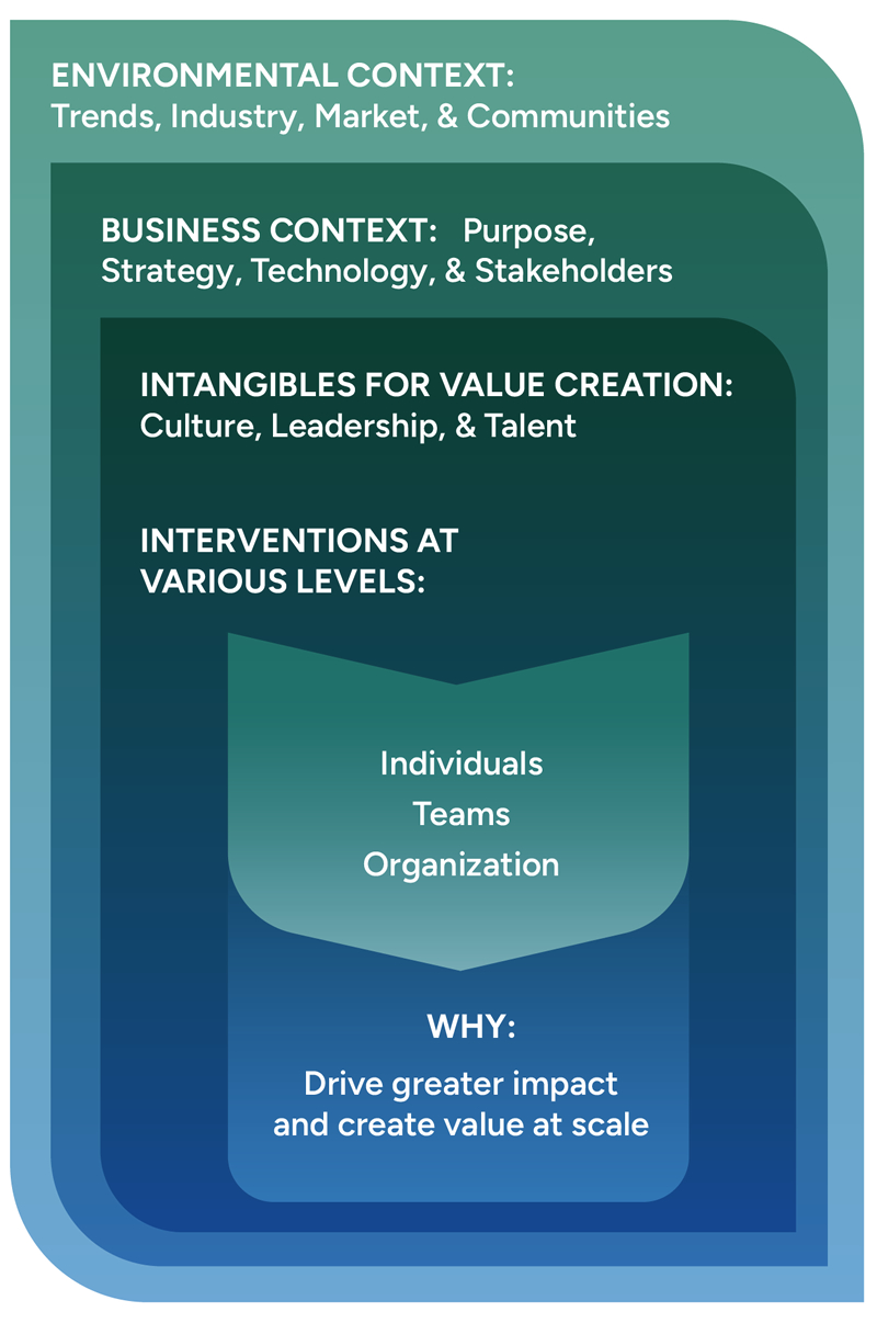 We make sure efforts integrate with the broader context and related strategies of your organization – and not viewed as a separate "HR thing." We help people see how different elements work collaboratively within the broader ecosystem to drive impact for your organization’s people and purpose.